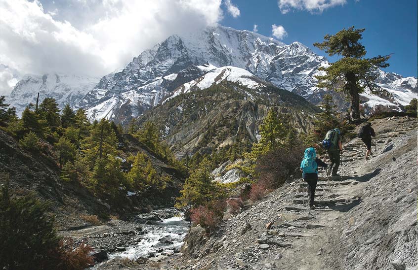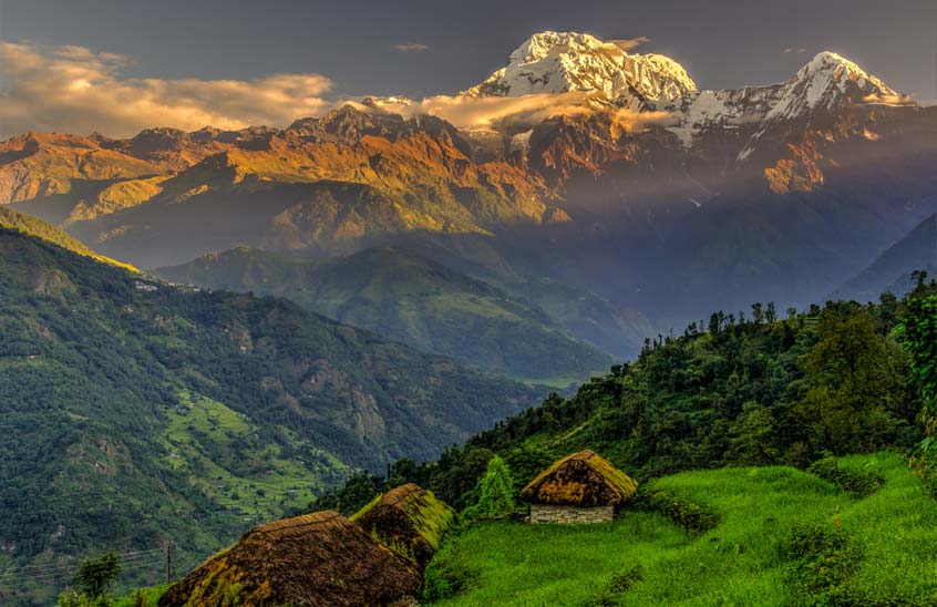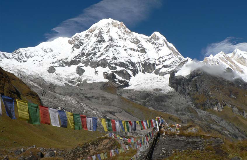 Trek grandiose au coeur du massif des Annapurna jusqu'au camp de base Sud (4130m), au pied du Géant (8091m). 11 jours de trek en lodge.