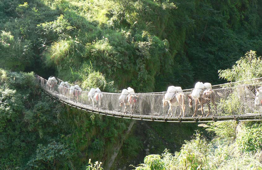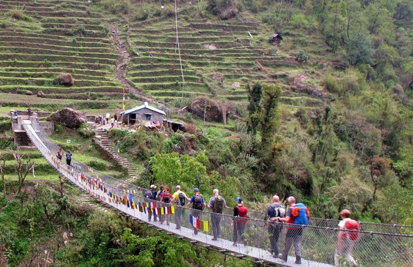 La piste descend par un escalier en pierre et traverse la rivière Chomrong Khola par un pont suspendu. Vous vous engagez sur un sentier étroit dans une végétation dense. La vallée est encaissée, et de très nombreuses chutes d'eau jalonnent l'itinéraire. A partir de Sinuwa, une vue spectaculaire s'ouvre pleinement sur le Macchapuchare et le Gangapurna.