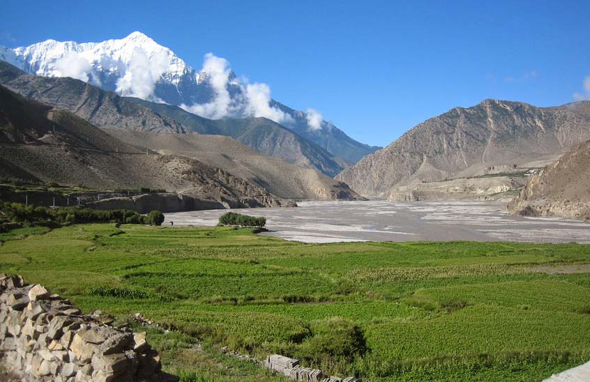 Vous descendez sur Melanje. A partir de ce village, le sentier dévale les champs de pommes de terre et de maïs en terrasses. Vous traversez la Kimrong Khola par un pont suspendu et commencez alors à grimper jusqu'à Chomrong (2170m). Traversée de beaux villages gurung, ethnie principale des Annapurna. A Chomrong, le panorama s'ouvre sur le Hiunchuli et le Macchapuchare.